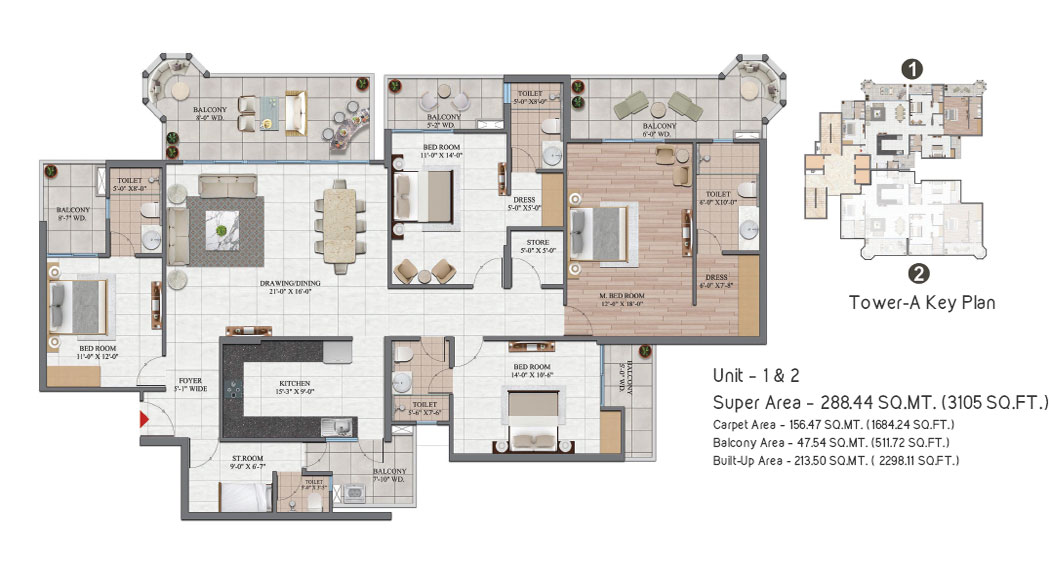 - Spacious Balcony with all bedrooms